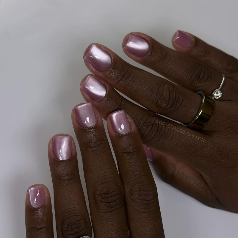 A soft metallic mauve that reflects light subtly. Sophisticated and luminous on deeper skin tones.
