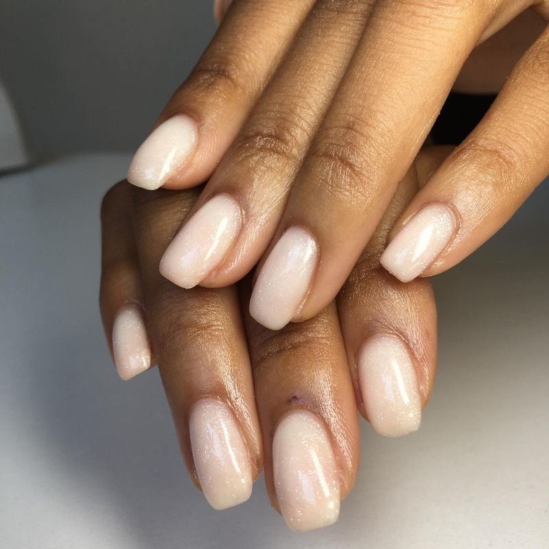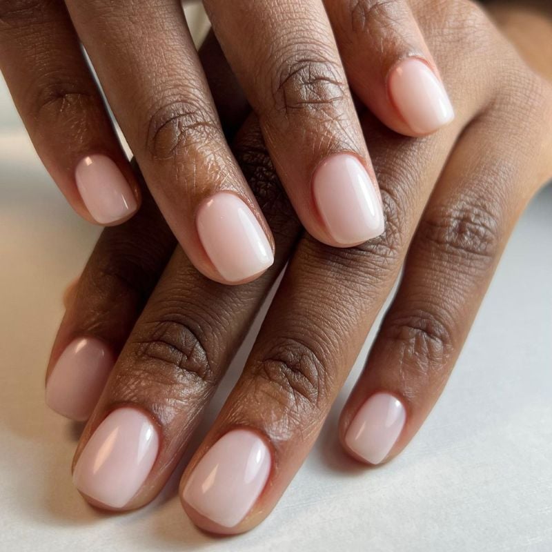 A minimalist approach featuring short, rounded nails with a sheer pink tint. It is a “your nails but better” look that highlights healthy, well-groomed hands.