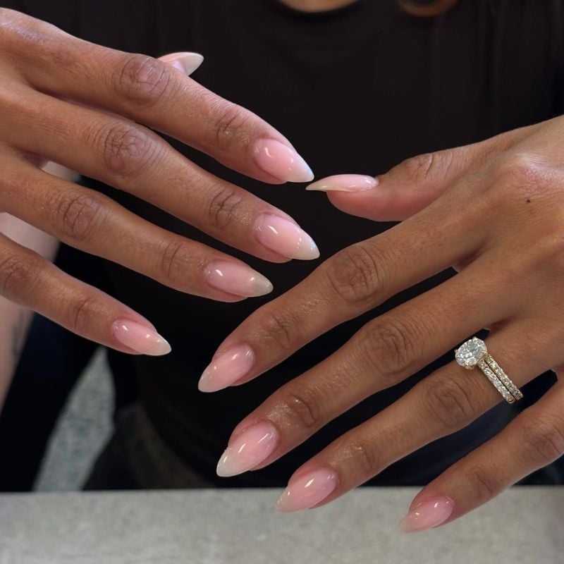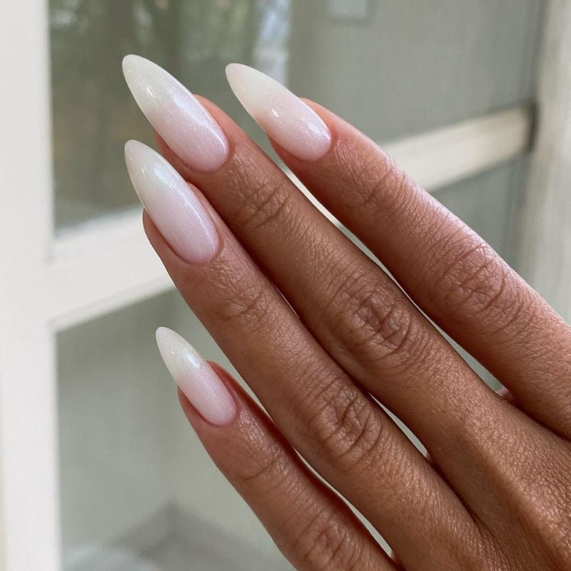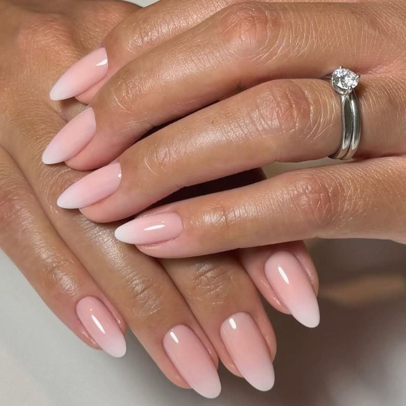 Graceful almond nails featuring a soft gradient from a natural base to milky white tips. This timeless “boomer” style elongates the fingers and looks effortlessly chic.