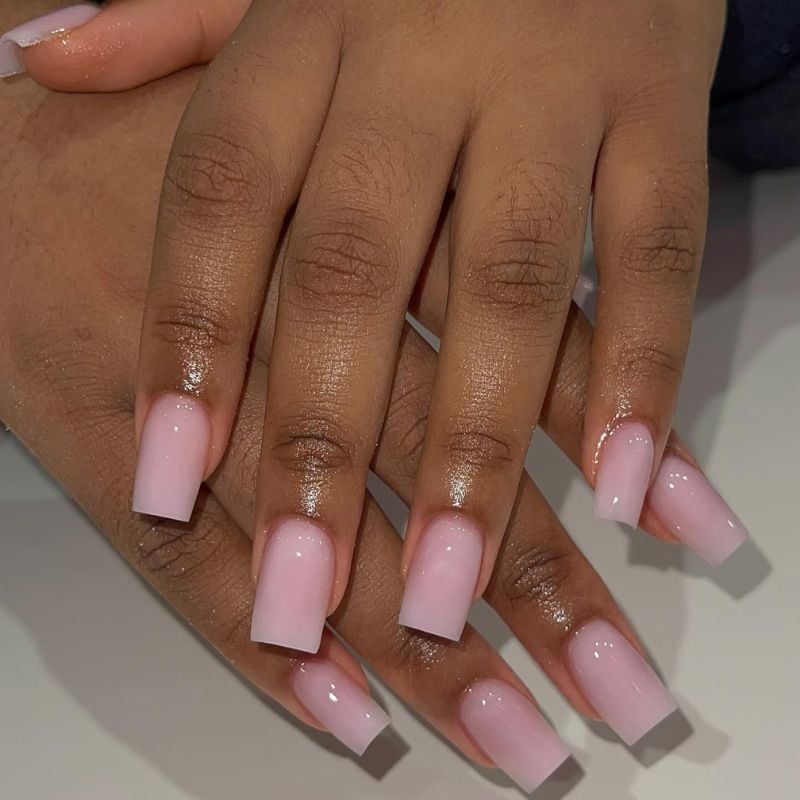 A soft, translucent baby pink is applied to long square nails. This “milky” finish provides a clean, sophisticated contrast that makes deeper skin tones glow.