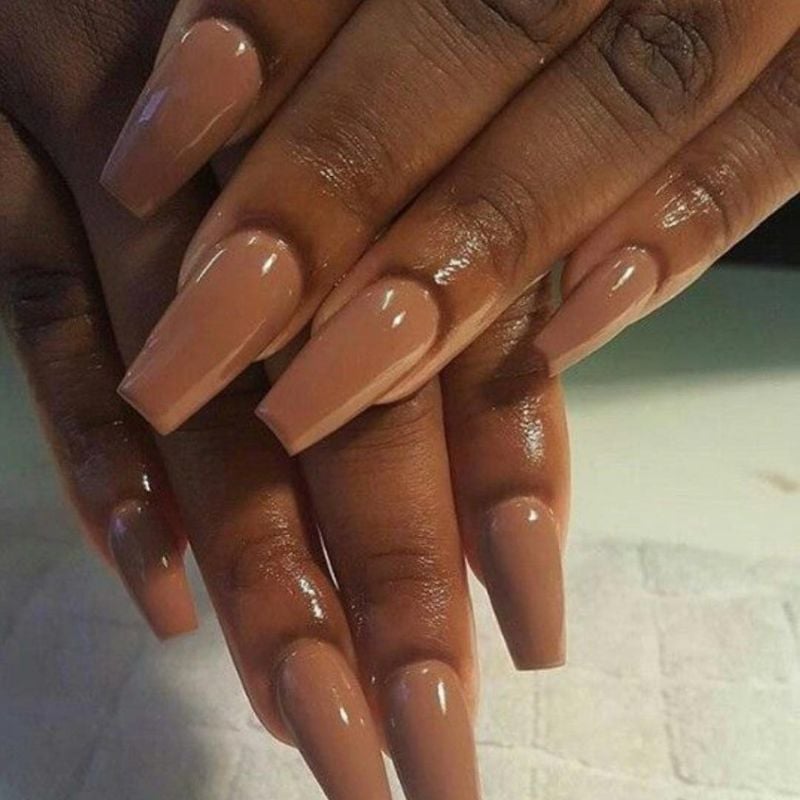 These long coffin-shaped nails feature a rich, warm caramel-brown shade. The glossy finish creates a seamless, monochromatic look that is incredibly flattering and modern.
