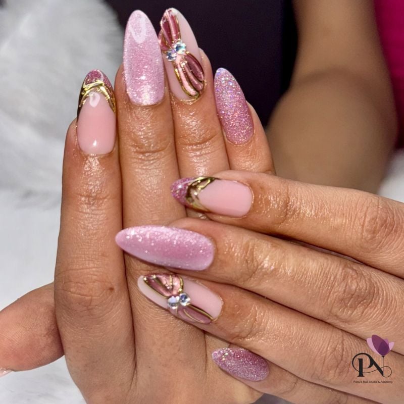 Intricate almond nails combining pink glitter, 3D golden bow accents, and sparkling rhinestones. This design is perfect for special occasions where you want to shine.