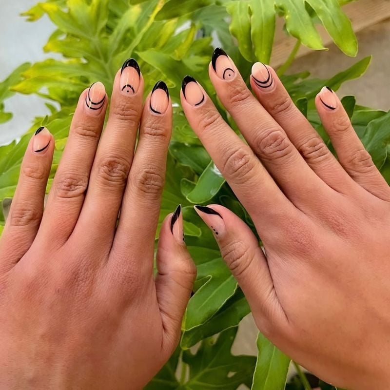 A creative nude base decorated with thin, artistic black swirls and delicate dots. This modern, minimalist art style is both trendy and visually intriguing.