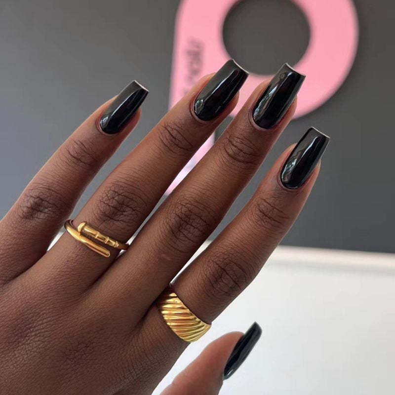 Deep, jet-black square nails with a flawless glass-like finish. The dark pigment creates a bold, powerful statement that looks stunning against rich skin tones.
