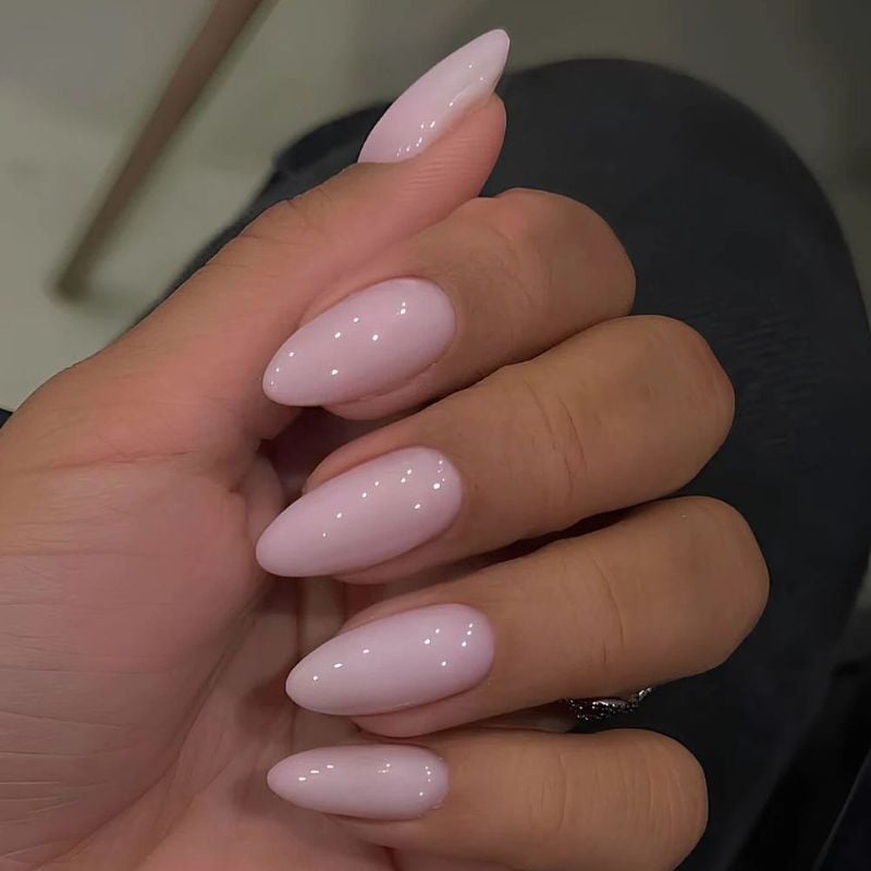These elegant almond-shaped nails feature a creamy, pale lavender-pink shade. The cool undertone of the polish provides a refreshing and sophisticated contrast against deeper skin tones.