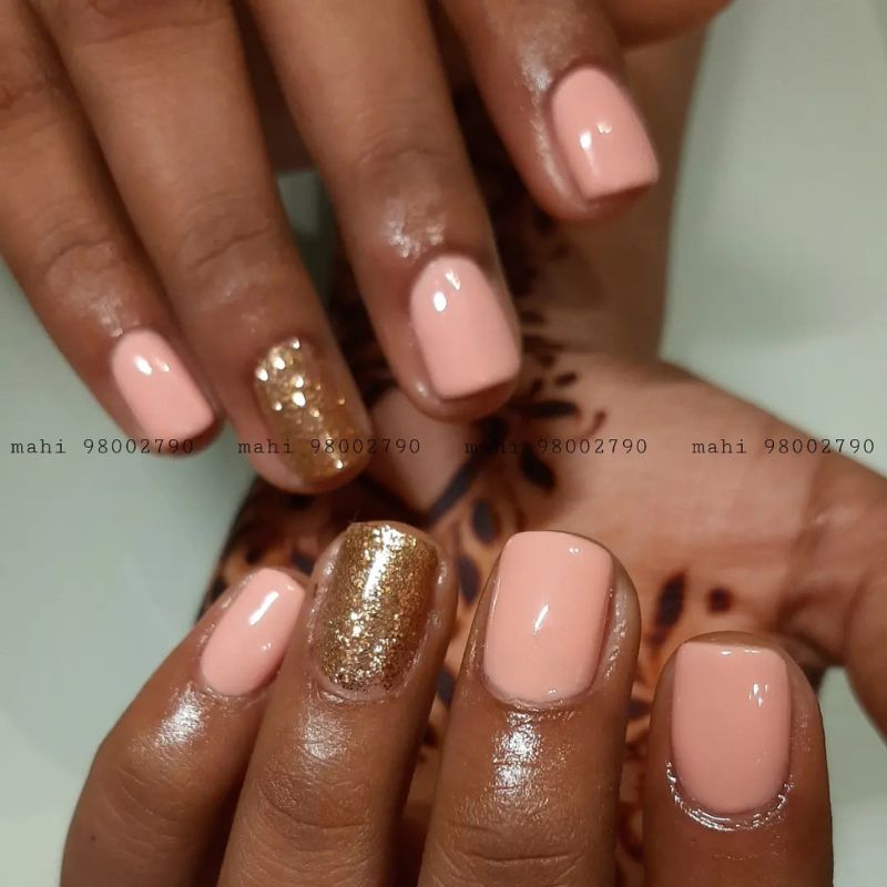A charming combination of soft peach-toned short nails paired with a bold gold glitter accent. This look is perfect for adding a bit of festive personality to a clean, natural manicure.