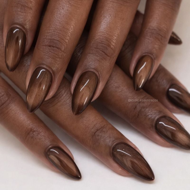 Deep chocolate tones with a glossy metallic effect that enhances natural depth. Luxurious and striking.