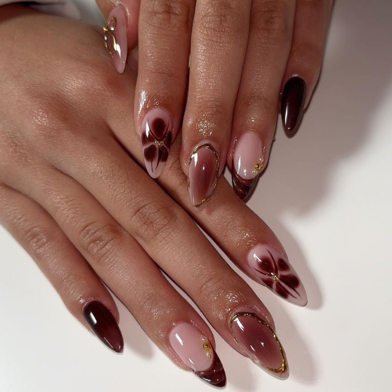 A blend of deep burgundy and nude with gold detailing. Romantic and elevated with artistic flair.