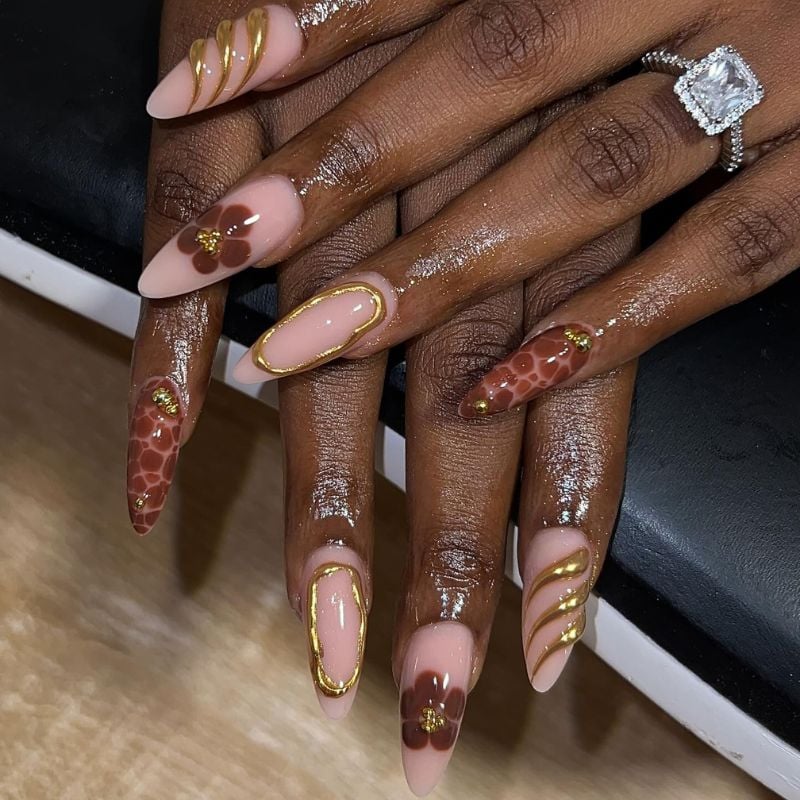 Soft nude nails framed with gold accents and delicate floral details. Elegant contrast that enhances melanin-rich tones.