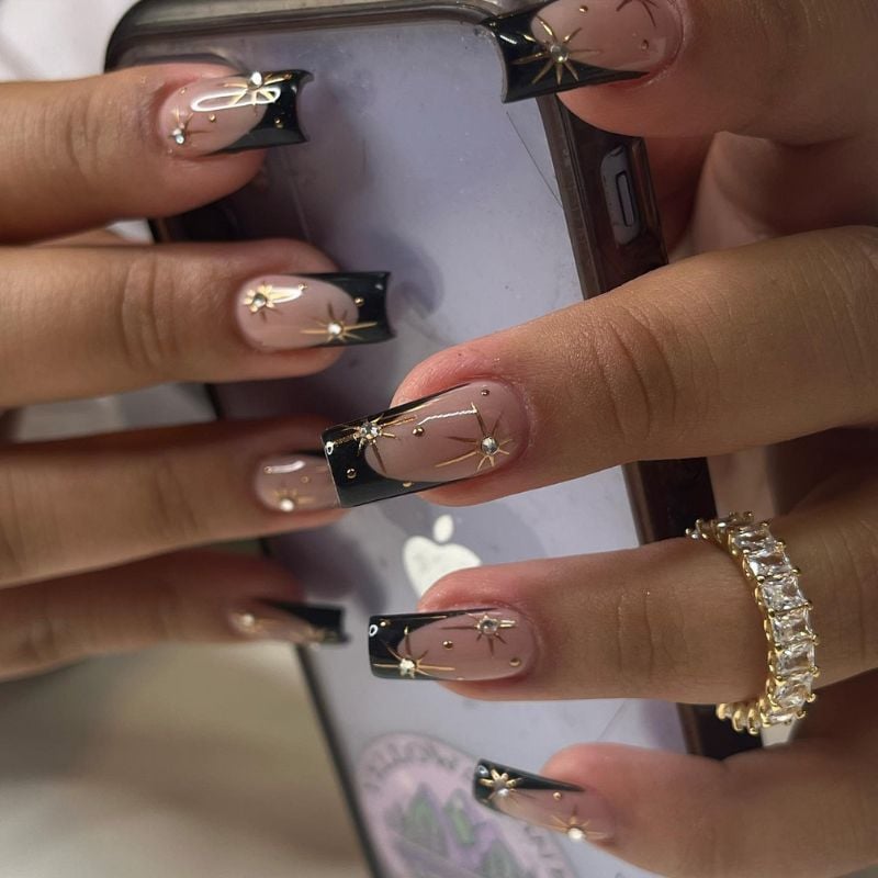Square nude nails with black French tips and gold star-inspired accents feel modern and chic. Complementing gold, black, or midnight blue dresses with gold liner and soft matte nude lips.
