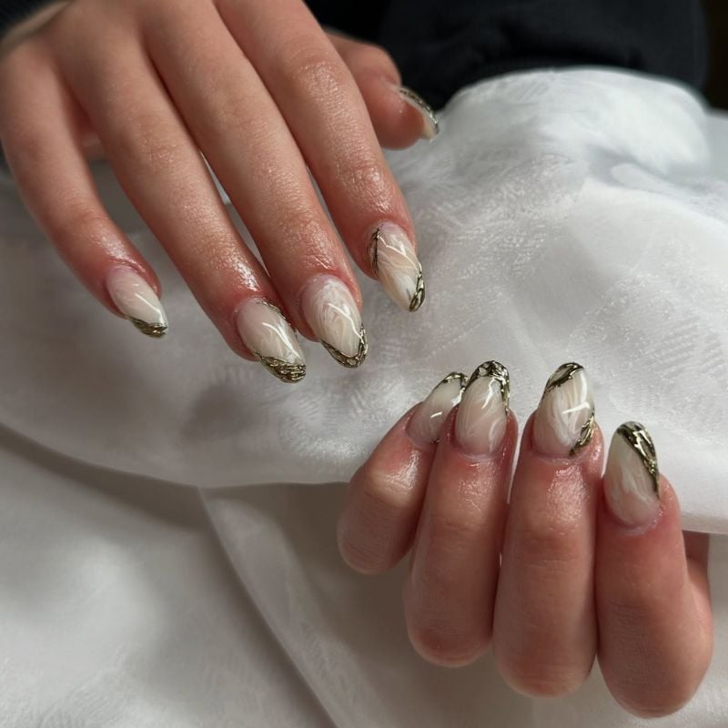 Short almond-shaped nails featuring soft white marble effects, subtly outlined in gold, offer understated elegance. That pairs beautifully with ivory, champagne, or sage dresses and peach-toned makeup, with radiant skin.
