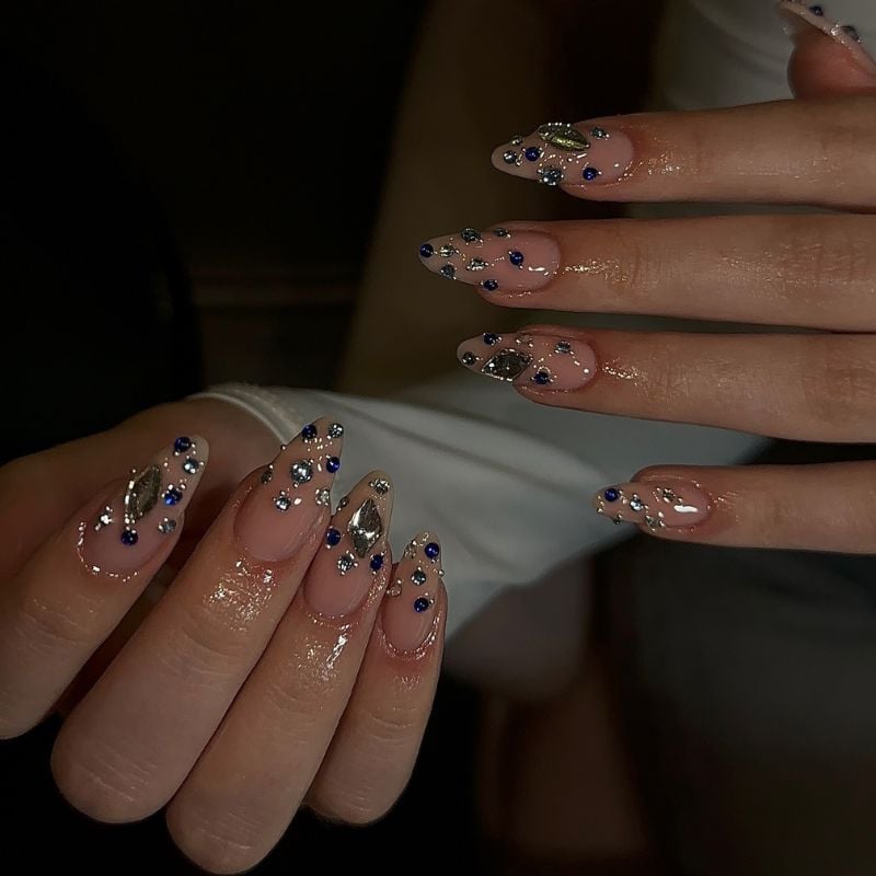 Sheer nude almond nails decorated with scattered blue and silver gems deliver a delicate sparkle. That matches navy, silver, or icy blue dresses and cool shimmer eye makeup with glossy neutral lips.