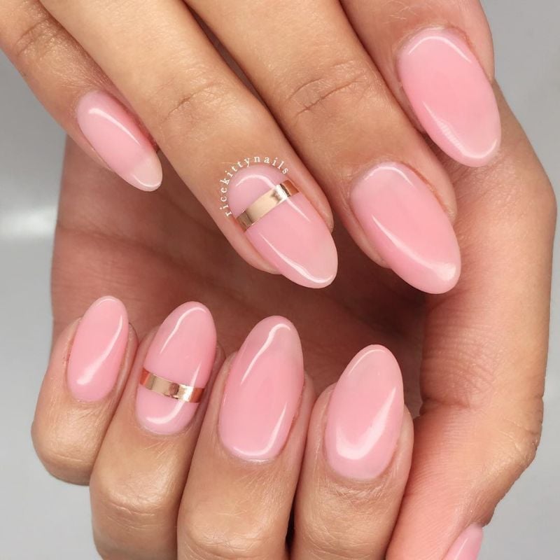 Glossy baby pink almond nails, finished with a sleek gold stripe, feel refined and modern, pairing effortlessly with white, blush, or light blue dresses and natural, glowing makeup with a soft pink lip.