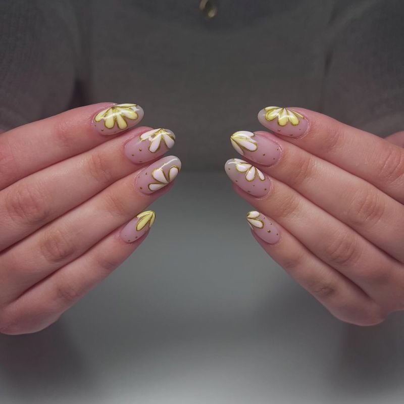 Short almond-shaped nude nails decorated with white and gold petal art and tiny gold dots give a classy yet creative finish that complements cream, sage, or light gold dresses, paired with warm bronze eyeshadow.