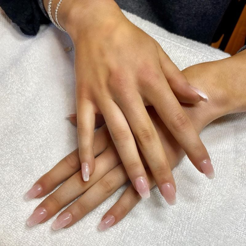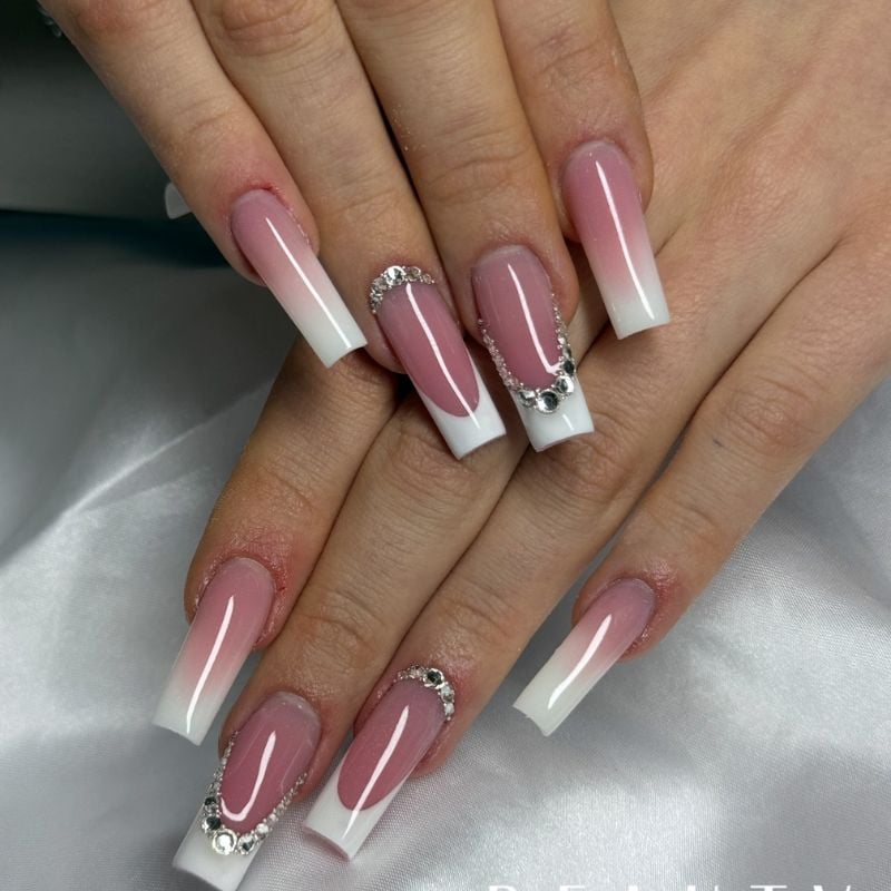 A soft pink-to-white ombré coffin design, finished with curved rhinestones, adds feminine sparkle that pairs beautifully with blush, silver, or pastel dresses, and shimmering pink eyeshadow with glossy lips.