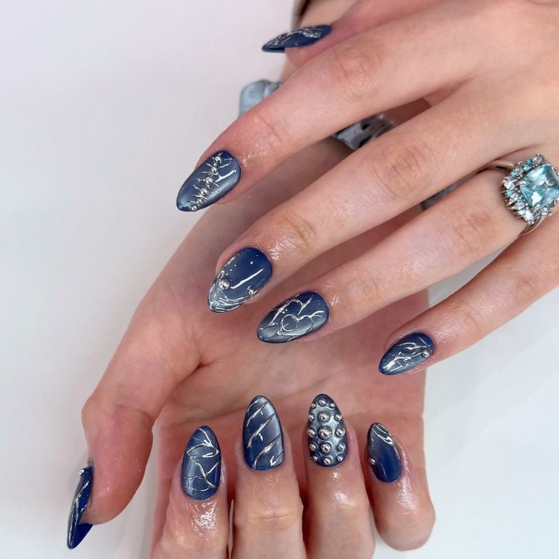 Deep navy almond nails with silver line art and gem details give a celestial, evening-sky effect that looks stunning with a silver, black, or navy satin dress and cool-toned makeup featuring silver shimmer and luminous highlighter.
