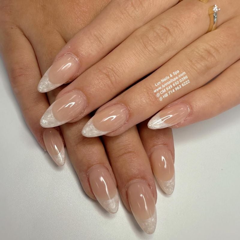 A nude almond base with soft milky-white tips offers a clean, bridal-inspired look that pairs perfectly with white, blush, or baby-blue dresses and fresh, radiant makeup.