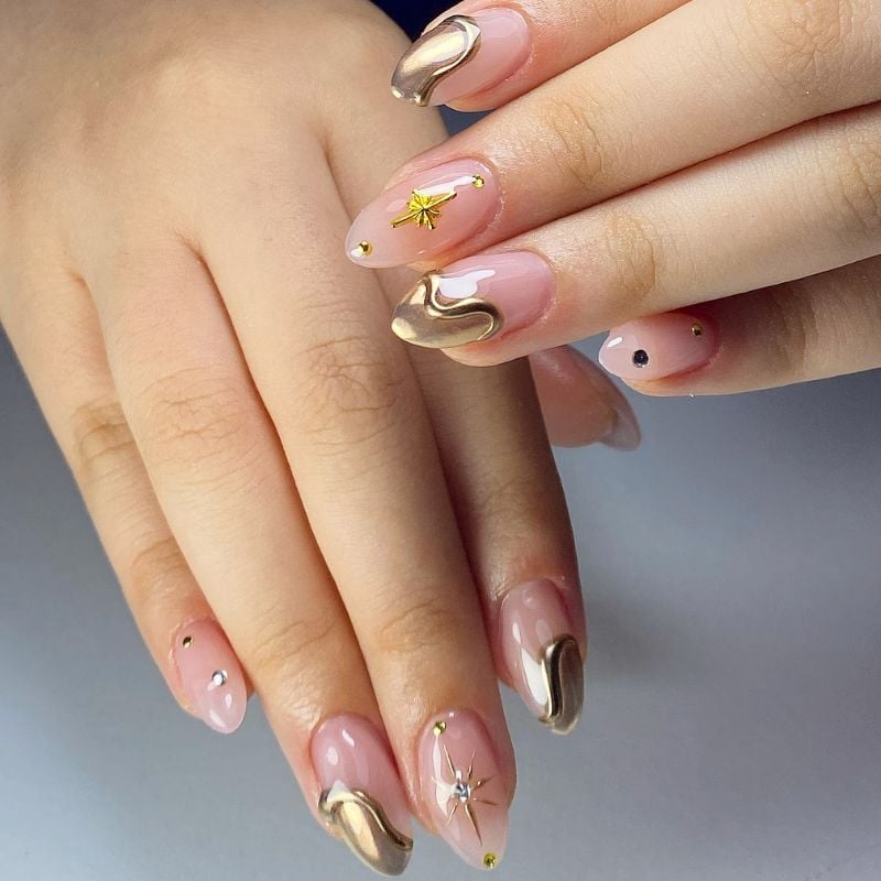 Soft pink nude nails with bold gold-chrome abstract accents and tiny gems feel luxurious and trendy, ideal for black, emerald, or gold dresses paired with gold-highlighted glam makeup.