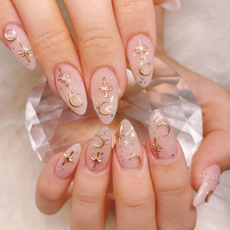 Sheer nude almond nails adorned with gold stars, moons, and subtle glitter give dreamy night-sky energy that pairs well with navy, silver, or metallic dresses, complemented by shimmering highlighter.