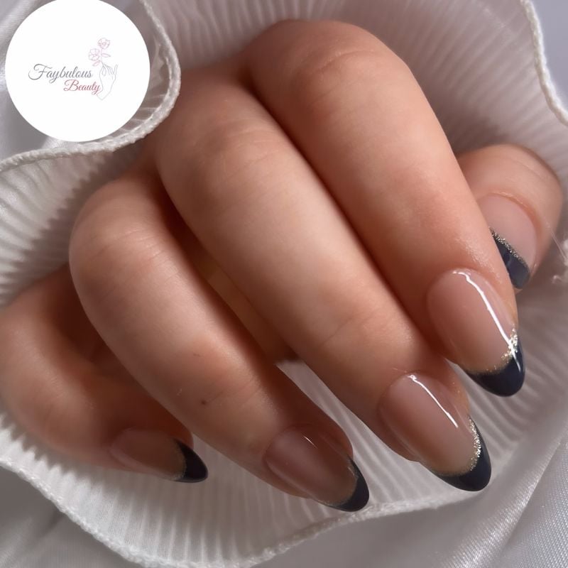 Almond nude nails with deep navy French tips outlined in silver glitter feel sleek and modern, perfect for midnight blue, silver, or black dresses with cool-toned smoky eyes.