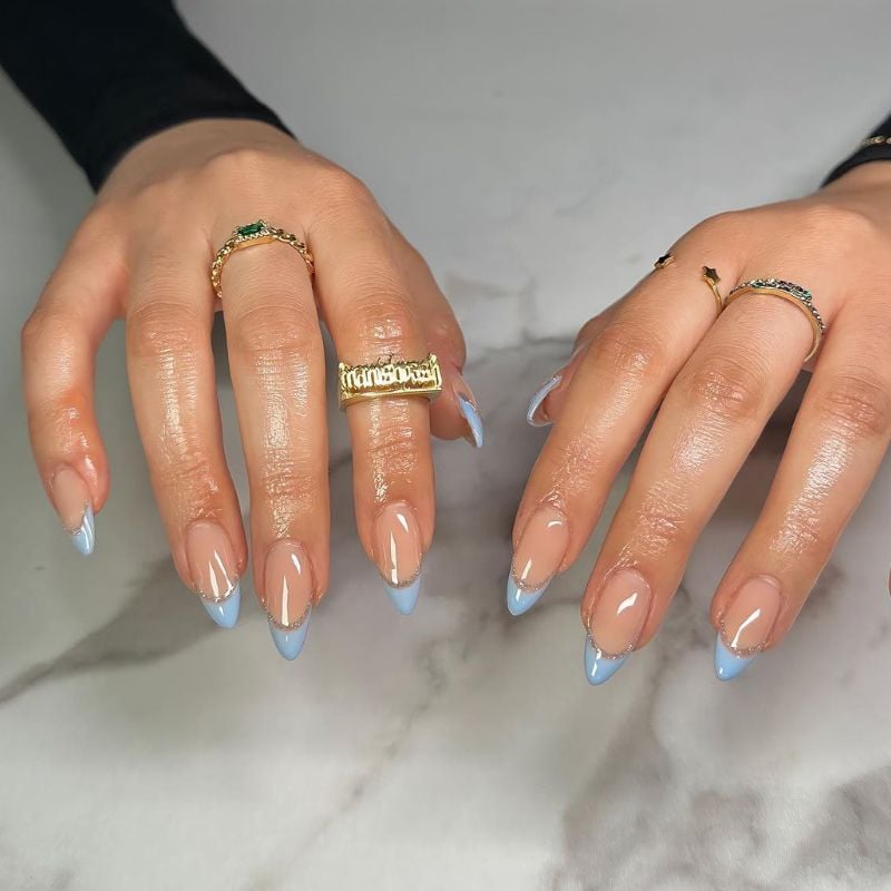 A soft nude base with pastel-blue French tips and a delicate silver lining creates fresh elegance that pairs beautifully with light blue, white, or silver dresses and soft pink makeup.