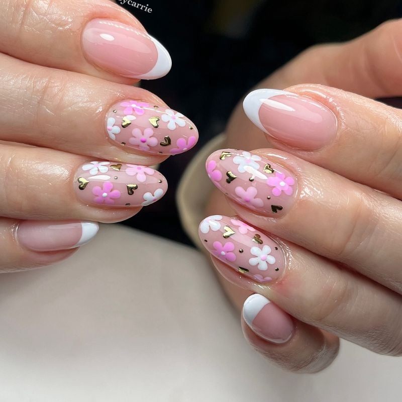 Glossy pink-and-white French nails with playful floral accents and tiny gold hearts feel youthful and sweet, ideal for blush or white dresses, with rosy cheeks and glossy lips.