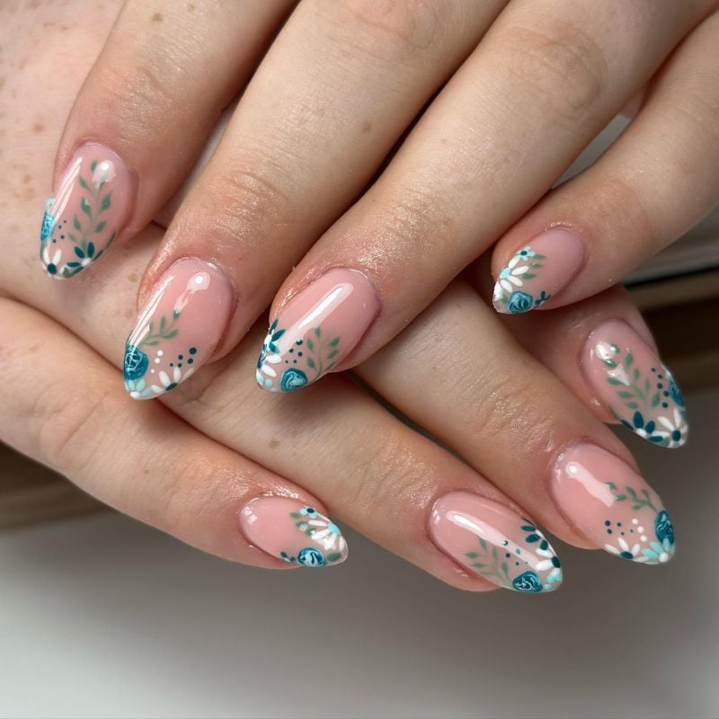 Nude almond nails with teal floral detailing and leafy accents add subtle color contrast that pairs perfectly with sage, emerald, or cream dresses and soft, earthy makeup tones.