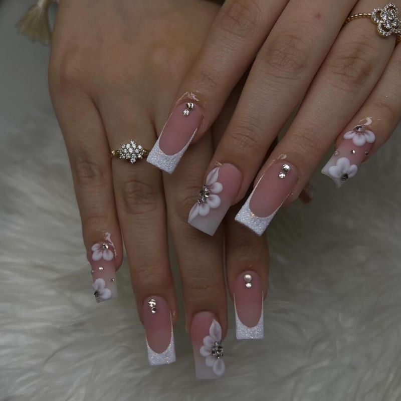Blush square nails with glittery white French tips, 3D floral accents, and crystal embellishments bring full romantic glam, perfect for silver, baby pink, or white dresses with luminous glam makeup.