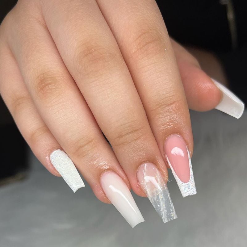 This long coffin set blends milky white, blush pink, and subtle glitter accents for a soft, romantic vibe that works perfectly with a baby pink, white, or light grey dress and rosy blush makeup with a glossy pink lip.