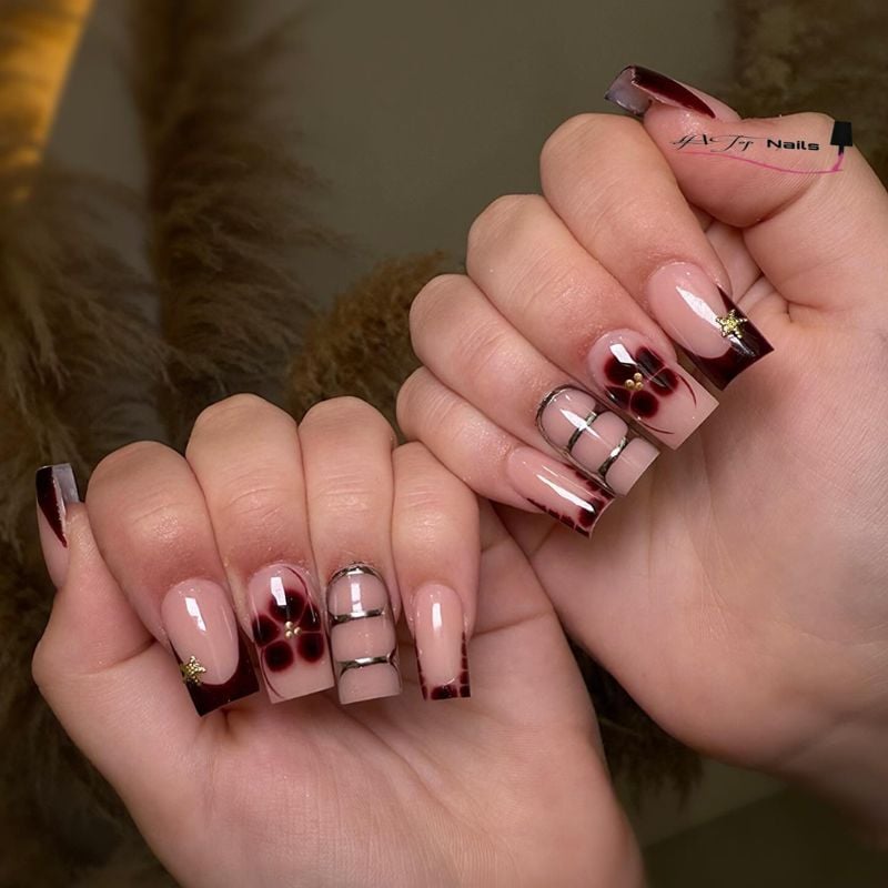 Deep burgundy French tips with abstract floral touches and subtle gold accents bring warmth and richness that complement champagne, gold, or dark red gowns with bronze eyeshadow and a berry-toned lipstick.