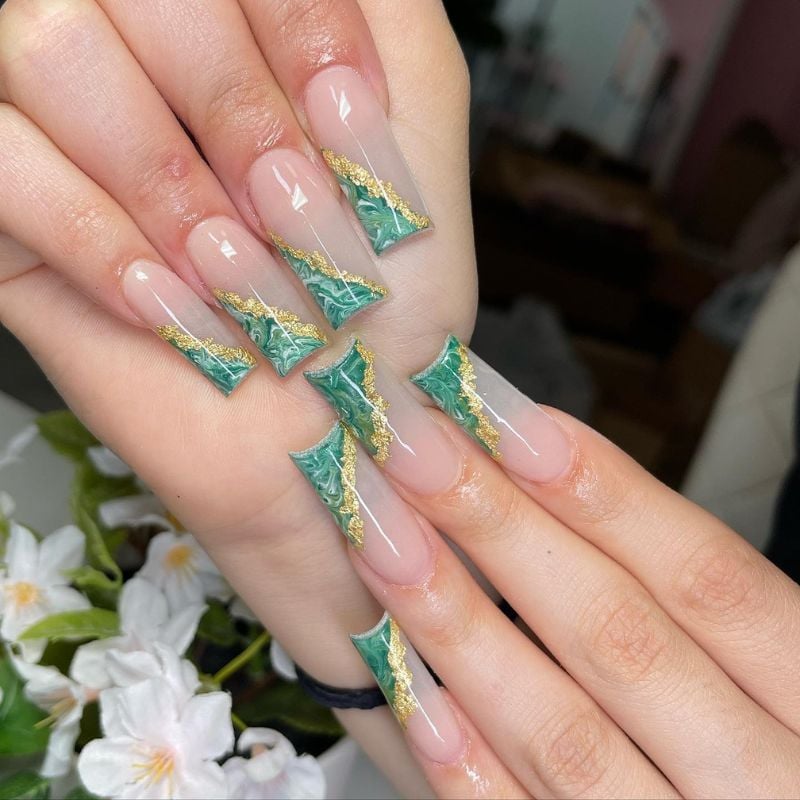 Transparent nude bases with bold green marble tips, edged in gold foil, create a luxurious statement that looks stunning with black, emerald, or gold dresses, and with gold-accented eye makeup and a neutral matte lip.