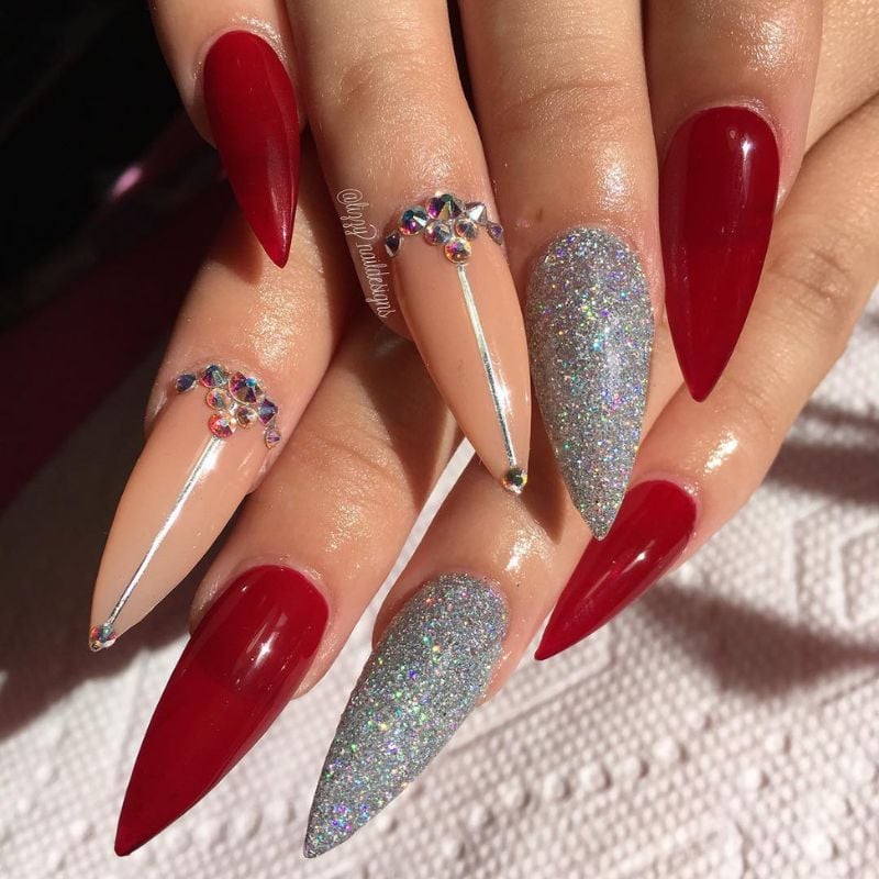 Bold red stiletto nails mixed with silver glitter and rhinestone clusters create dramatic prom energy. That pairs best with black, silver, or deep red gowns and a classic red lip with defined lashes.