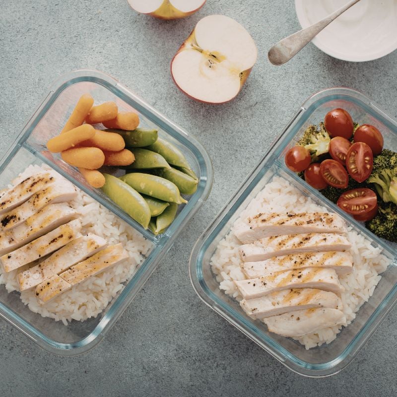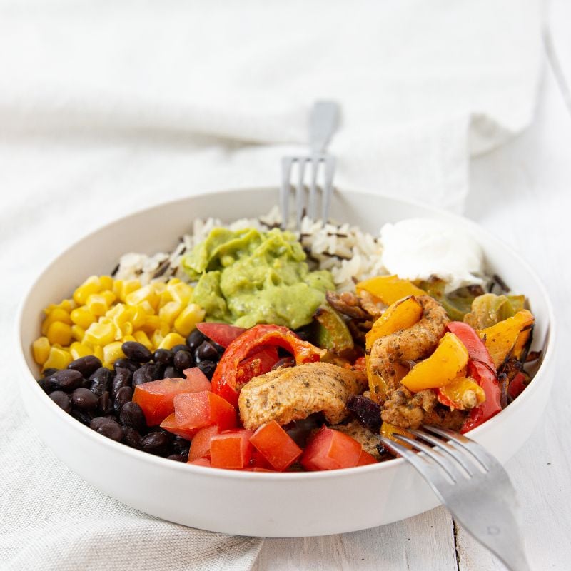 - Lunch: Chicken rice bowl with lettuce, salsa, and avocado